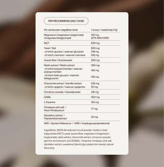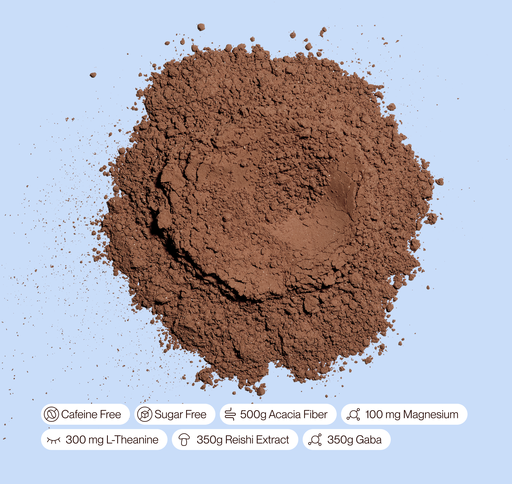 38,6% fat-reduced cocoa powder, medium-chain triglycerides (MCT), yeast, acacia fibre, magnesium (magnesium bisglycinate), reishi extract, chamomile extract, cinnamon powder, gamma-aminobutyric acid (GABA), l-theanine, himalayan pink salt, dandelion extract, sweetener (steviol glycosides from stevia), natural flavouring.
